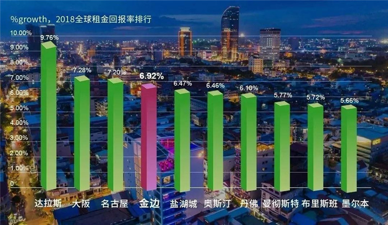 目前,金边的租金回报率在全球来看都是十分吸引人的!根据早前“ 海外掘金”发布的《2018全球城市租金回报率》榜单显示,柬埔寨金边的租金回报率达到了6.92%,超越大多数发达国家,排名全球第四、东南亚第一。未来,金边租金回报可预见的还将有一波新的上涨。